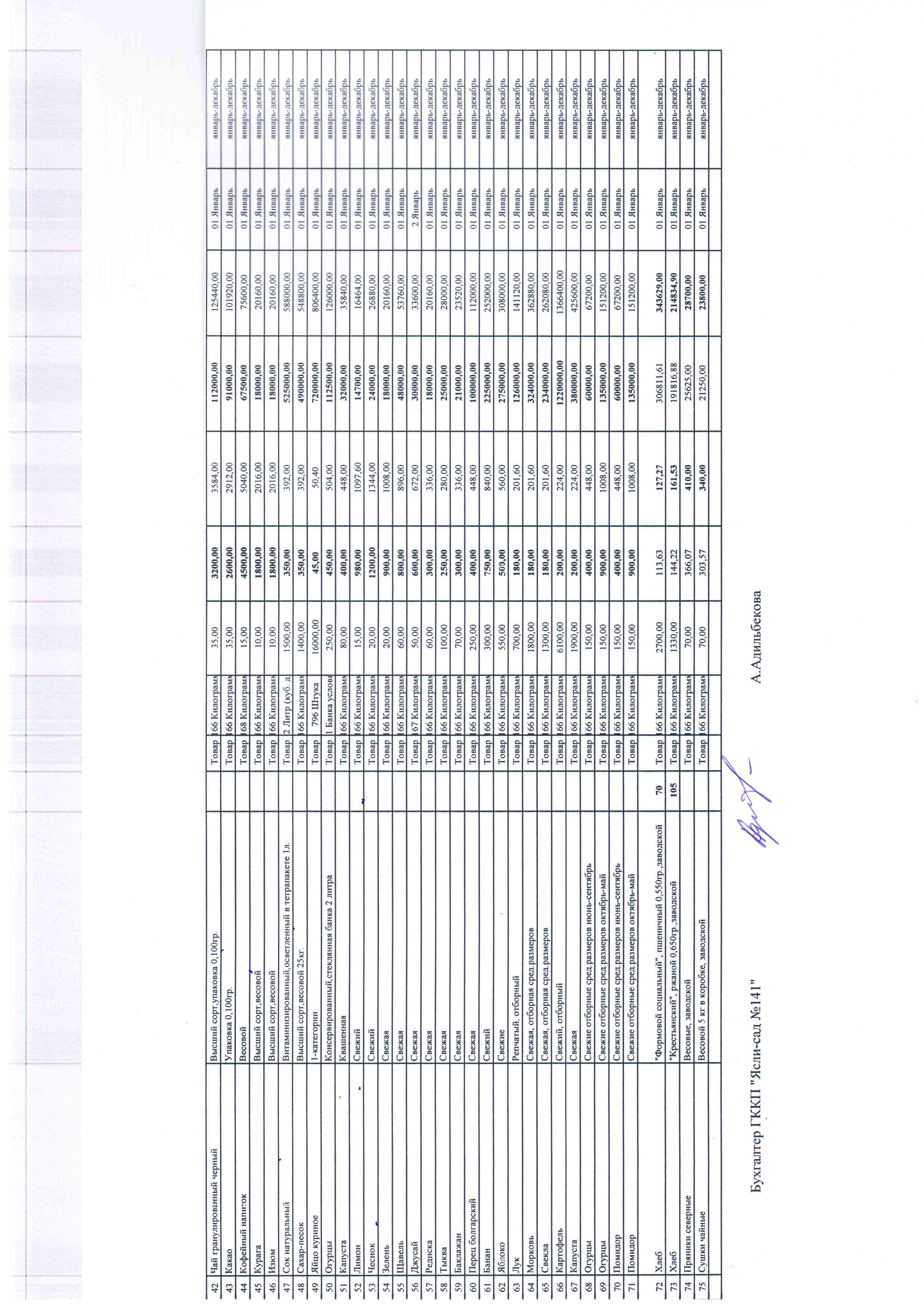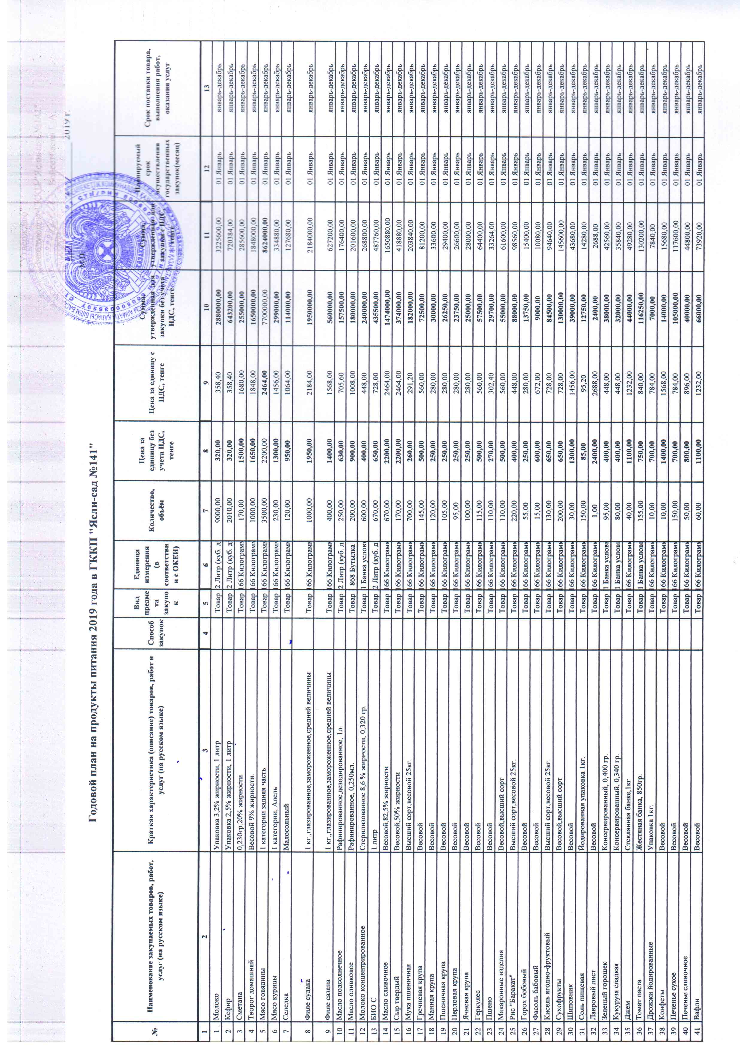 Годовой план на продукты питания 2019 год.